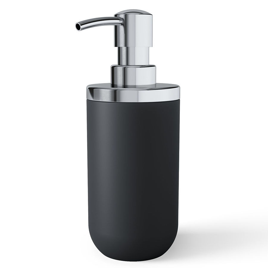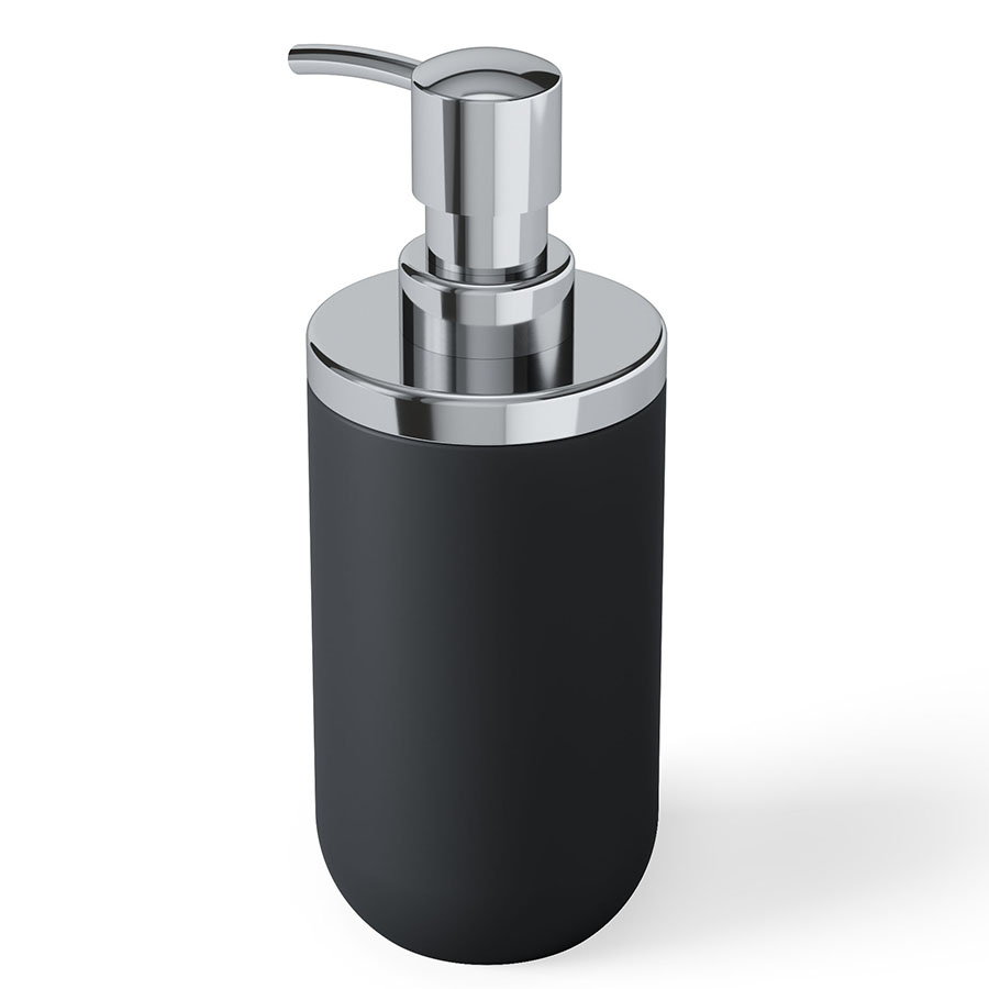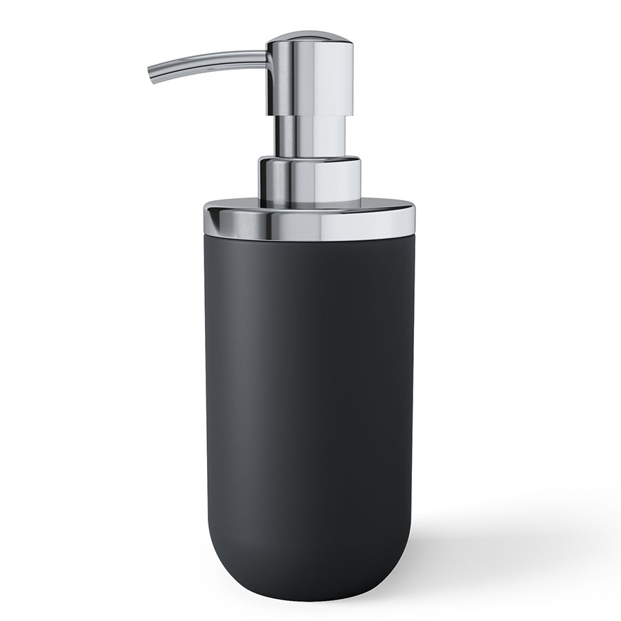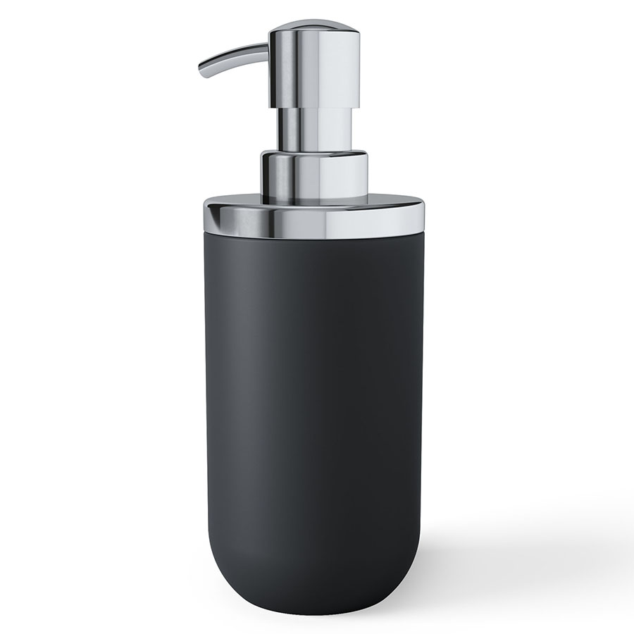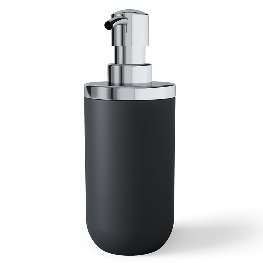 Диспенсер для мыла Junip может стать украшением как ванной комнаты, так и кухни. Емкость представлена в утонченном дизайне, которому свойственны плавные линии и черная матовая поверхность. Благодаря эргономичной крышке серебристого цвета, которую легко откручивать и закручивать, заправка диспенсера не вызывает затруднений и может быть выполнена за считанные минуты. Емкость из синтетической смолы отличается высокой прочностью и стойкостью к повреждениям. Аксессуар дополнит современный интерьер помещения. Диспенсер для жидкого мыла гармонично сочетается с другими аксессуарами коллекций Junip и Droplet.