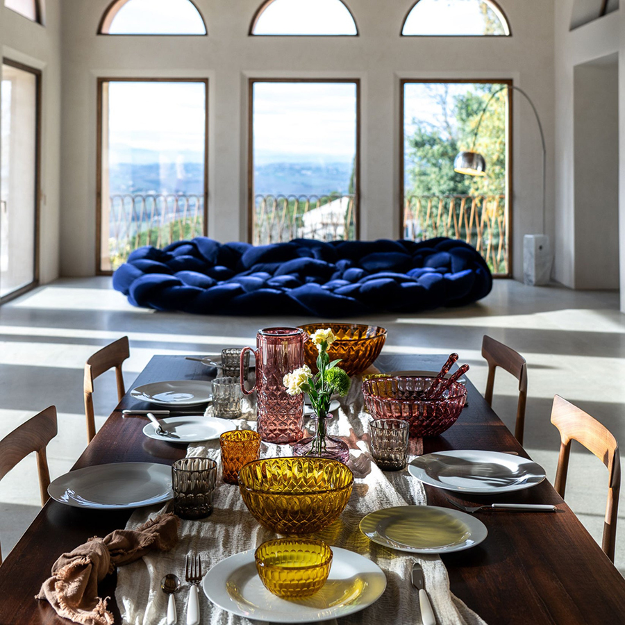 "Кувшин с крышкой Vanity от итальянского бренда Guzzini – необычная посуда, в которой гармонично сочетаются привлекательный дизайн и практичность. Благодаря высокой устойчивости современного органического материала к внешним воздействиям, она идеально подходит для сервировки как в помещении, так и на свежем воздухе. Инновационный биопластик получают из растительных отходов. За счет особенной рельефной поверхности и ярких цветов предметы изящно переливаются на свету, что делает их еще более привлекательными. Материал не темнеет со временем, не выделяет вредных соединений, не меняет вкус и запах содержимого.