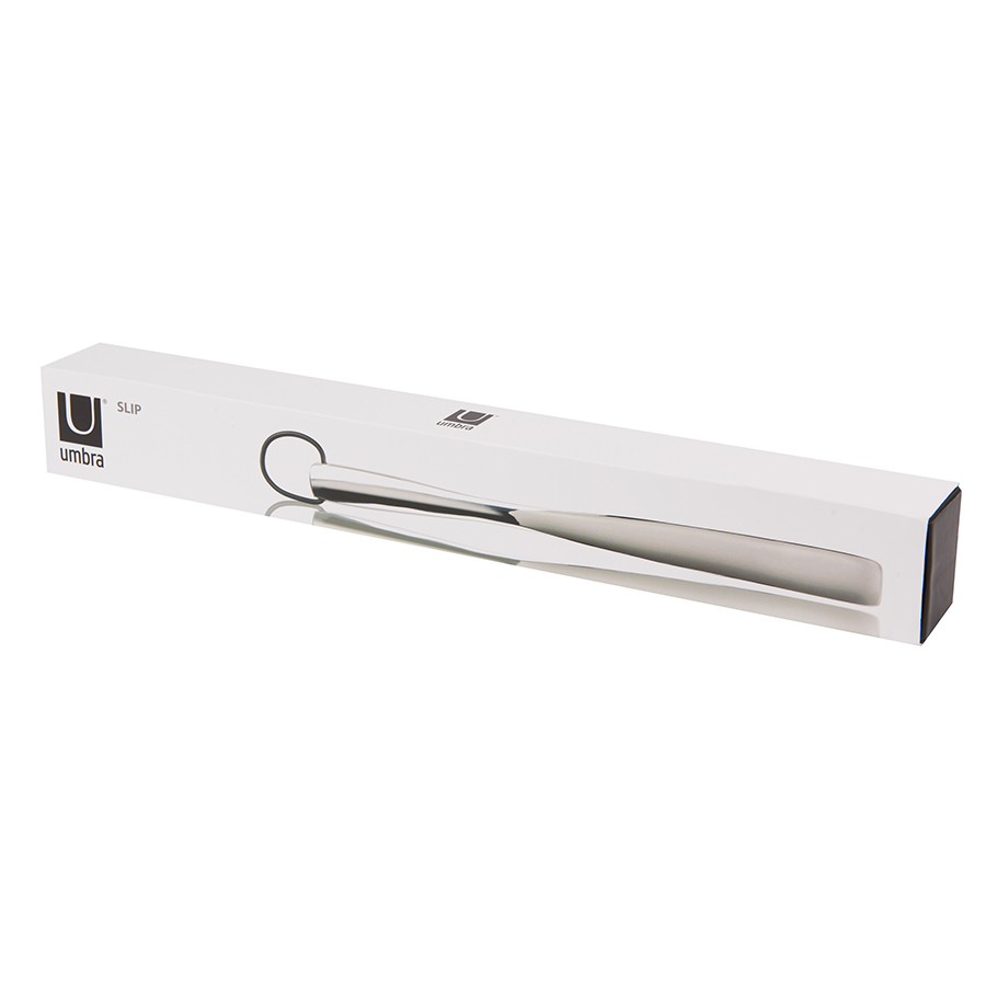 Для непростой обуви простое решение: стильная и элегантная ложка Slip. Изготовлена из литого алюминия с полированной отделкой, вешается на крючок за резиновую петлю. Замечательное решение для капризной обуви.