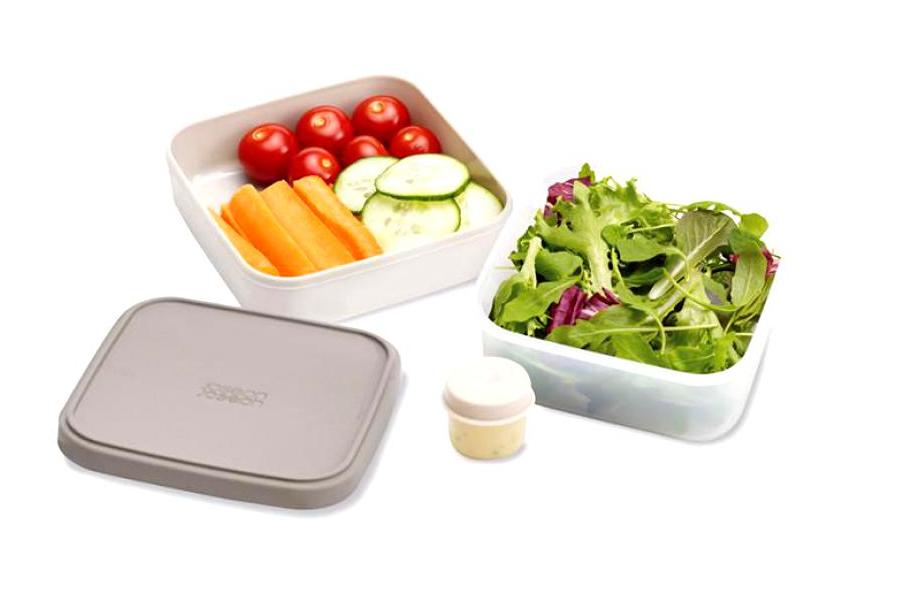 Если вам часто приходится обедать вне дома, то вы оцените удобство компактного ланчбокса GoEat от Joseph Joseph. Эти ланчбоксы состоят из двух довольно вместительных отделений, в которых можно хранить не только обычные бутерброды, но и салат, гарнир и даже соус для блюда. Контейнеры герметично закрываются при помощи специального кольца. В сложенном виде пустой ланчбокс занимает в сумке еще меньше места.