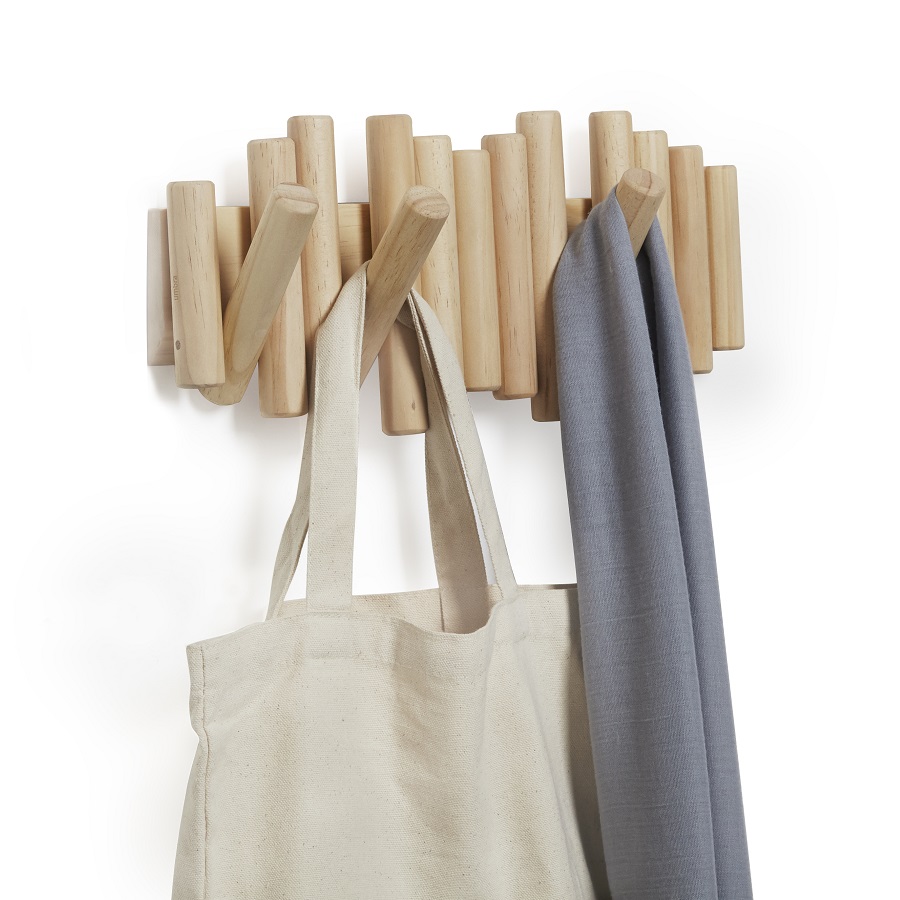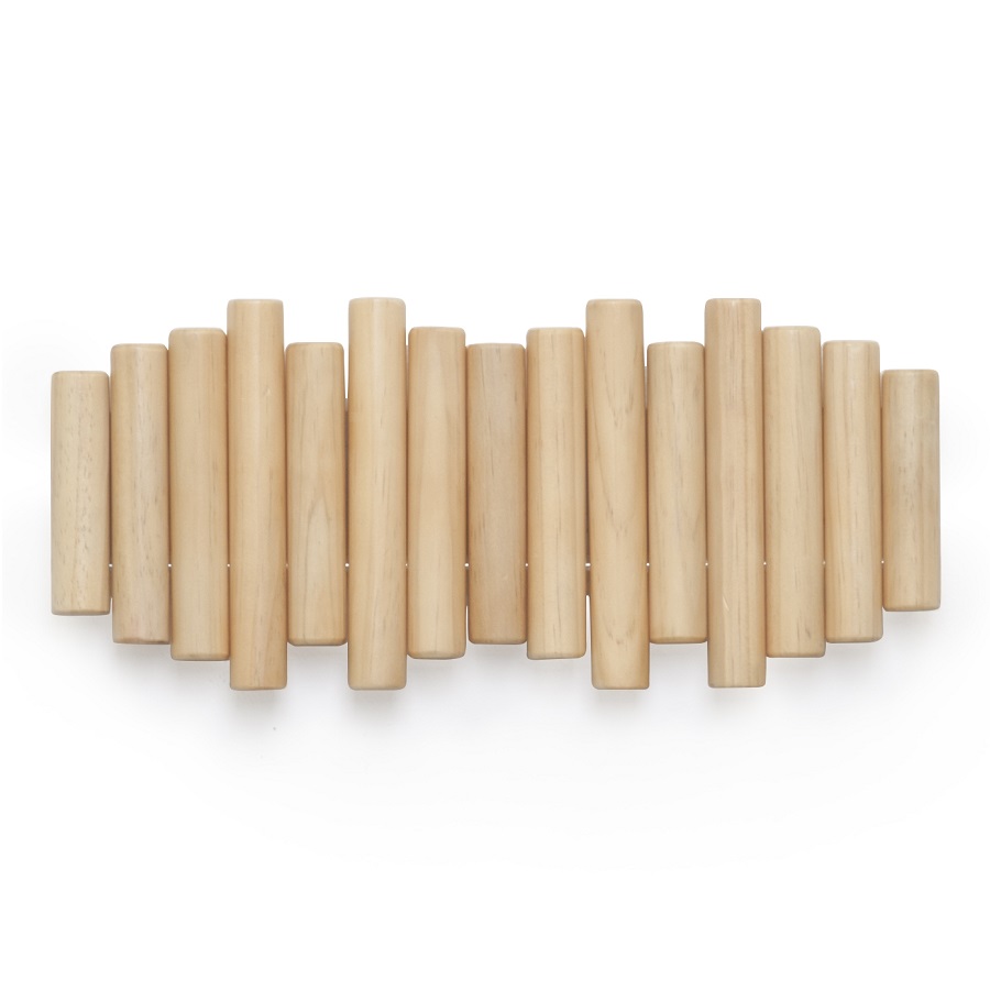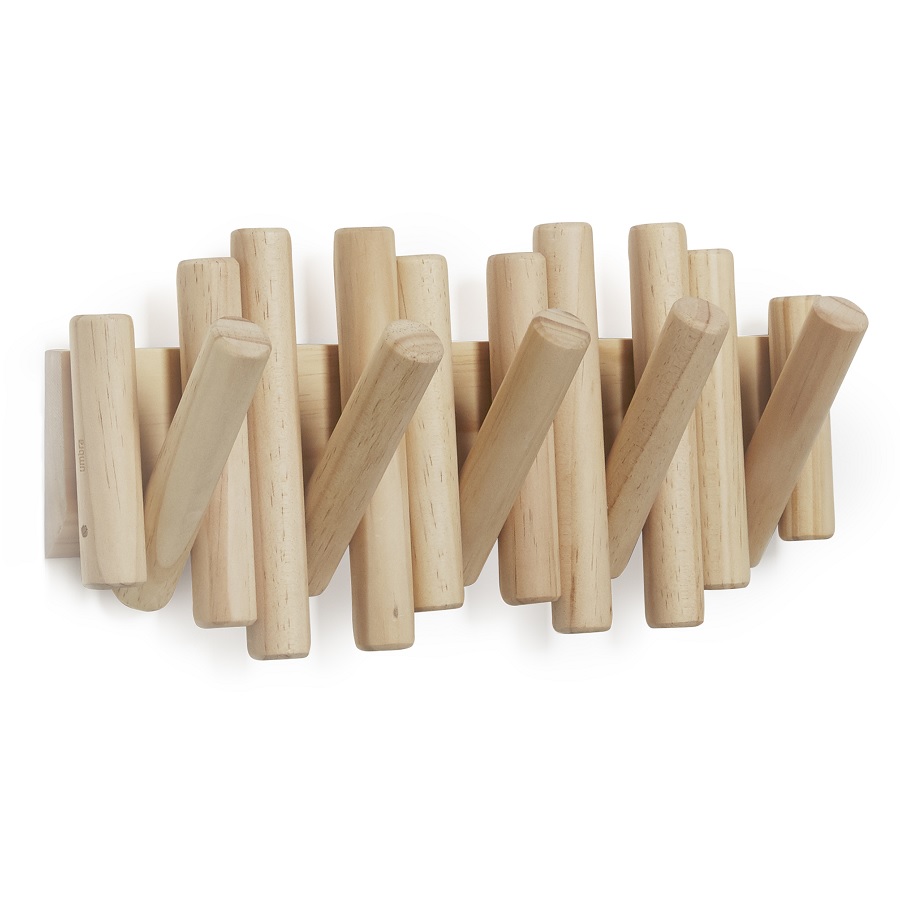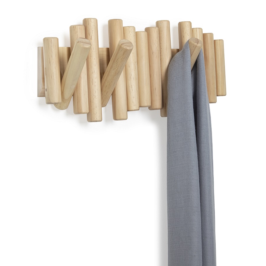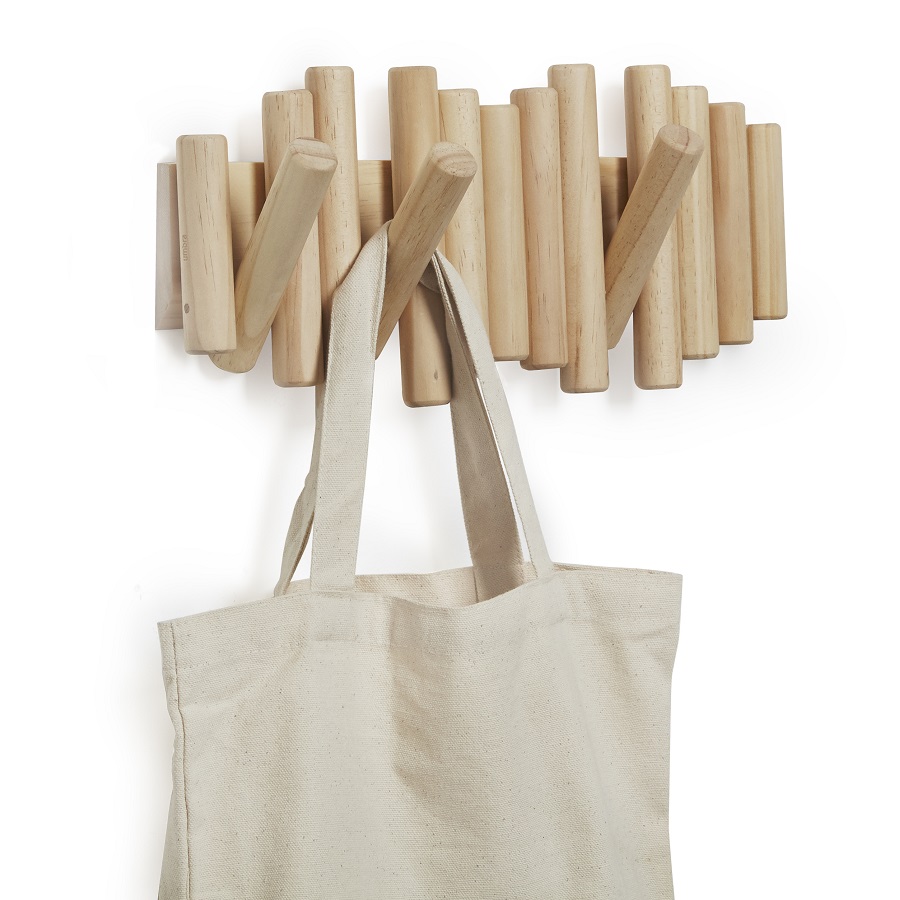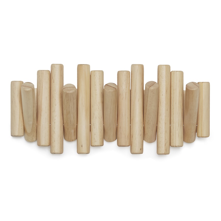 Настенная вешалка Picket – стильный аксессуар для прихожей или ванной комнаты. Благодаря натуральным материалам и интересной форме изделие потрясающе выглядит в современном интерьере. Вешалка состоит из сосновых колышков разных размеров. Аксессуар снабжен 5 складными крючками, которые способны выдерживать вес до 2,25 кг. Вешалка поставляется с набором крепежа.